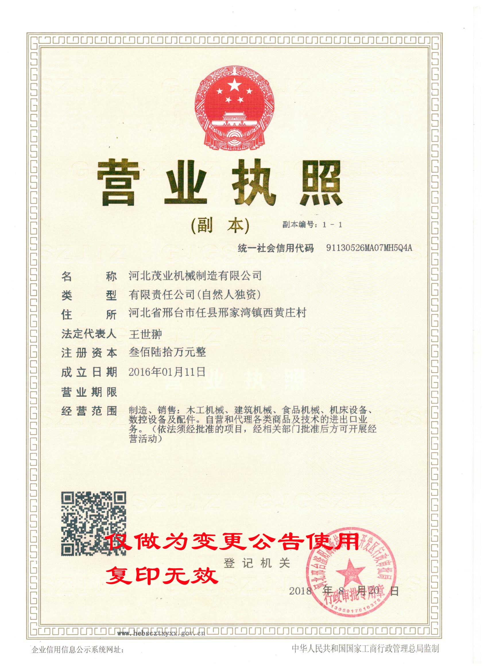 我司邢臺茂業(yè)機械制造有限公司,因公司業(yè)務發(fā)展的需要,現(xiàn)已整體變更為河北茂業(yè)機械制造有限公司,并于2018年8月20日取得河北邢臺滏陽高新技術產(chǎn)業(yè)開發(fā)區(qū)審批局頒發(fā)的營業(yè)執(zhí)照。現(xiàn)將有關事項公告如下: